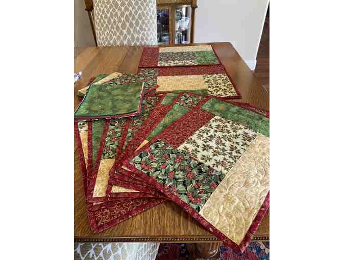 Ten Christmas-themed placemats 13" x 18" with ten matching 18" square napkins. Handmade and quilted. Washable.