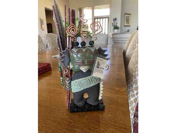 Each original clay piece is hand-made by Tris Ayers who decorates the pieces with various symbols, beads, stones, feathers & found objects. Her most supportive critic and best studio helper is her husband, Gary, who hand-cuts stones & hand works copper embellishments included on many pieces. Find joy, pleasure, and perhaps new inspiration as you live with this motivational work.