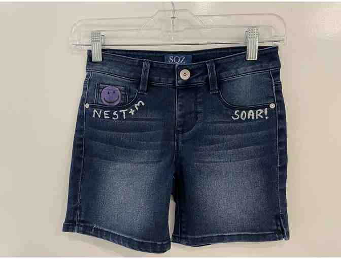 Junior Kid Blue Size 10 Blue Stretchy Denim Shorts, with NEST+m logo and happy face design!