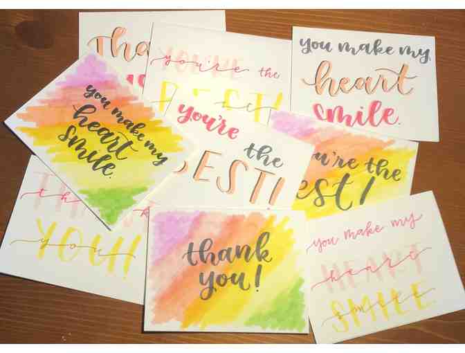 A set of 20 calligraphic cards (7 say "Thank You," 7 say "You Make My Heart Smile," and 6 say "You're the Best") made by BASIS Scottsdale graduate Esha S. '21.
