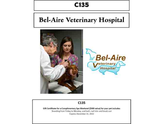 Gift certificate for a complimentary spa weekend for your pet which includes: boarding from Friday to Monday, bath service, nail trim, and brush out.