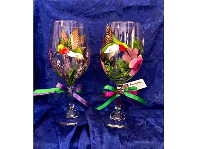 Our talented friend, Sherry O. Watters, of Weatherford, Texas offers this set of hand painted Humming Bird wine glasses in different floral settings.