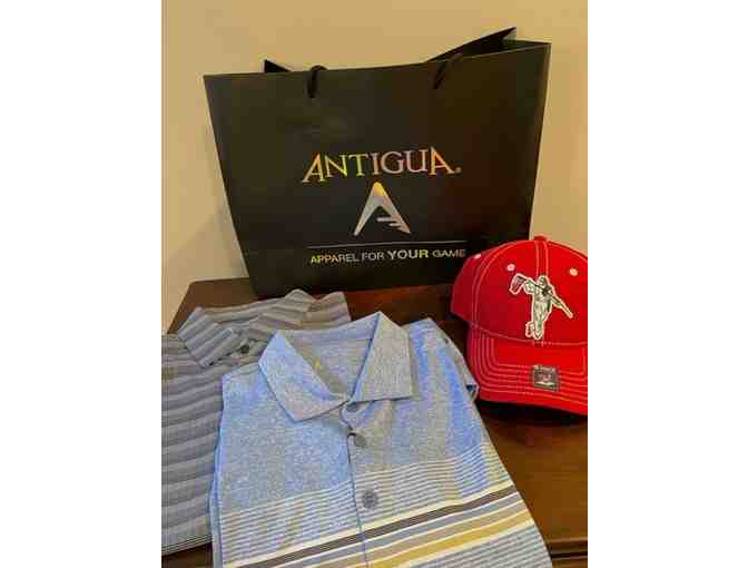 2 golf shirts - one in a muted Grey/White/Black pattern and