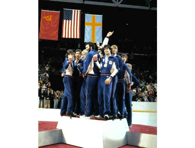 Podium photo (5" x 8") autographed by Jim Craig - legendary goalie of the 1980 U.S. Olympic Hockey Team also known as the "Miracle on Ice."