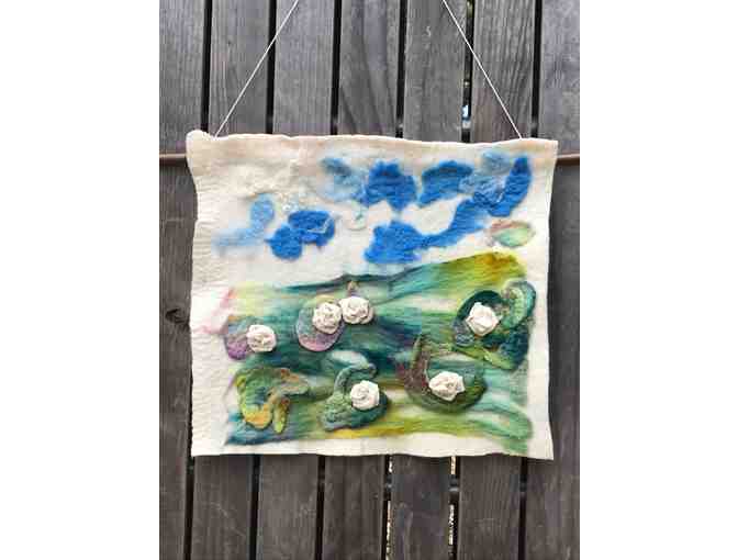 This unique and special felted tapestry measures 18 x 21, and was created by the White Rose kindergarten class here at Summerfield. This piece is combination of needle felting, which was done by the kindergarten teachers, and wet felting, done by the students themselves! A beautiful addition to a home or child's room.
