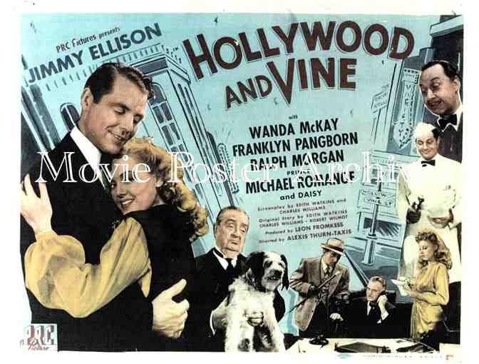 In 1944, the movie "Hollywood and Vine" was released as a California romantic comedy starring James Ellison, Wanda McKay, Ralph Morgan and Daisy the dog. This item is an 11 x 14 reproduction lobby card (on card stock) in 'very good' condition from Movie Poster Archives.