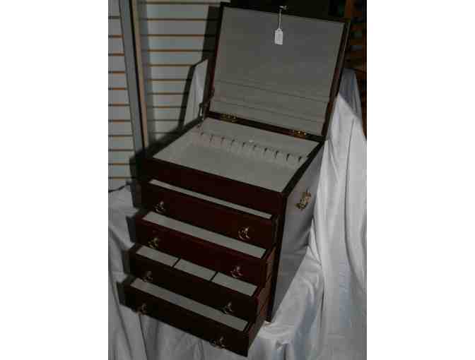A four drawer jewelry box with the lid opening to add an additional storage space.