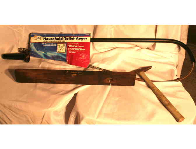 This Lot contains used Auger, Vintage Wooden Level, and Tack Hammer.