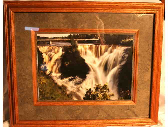 Four waterfall photographs are mounted in solid oak frames. The largest frame is 23" x 19", the medium frames are 18" x 14", and the small frame is 8" x 10".