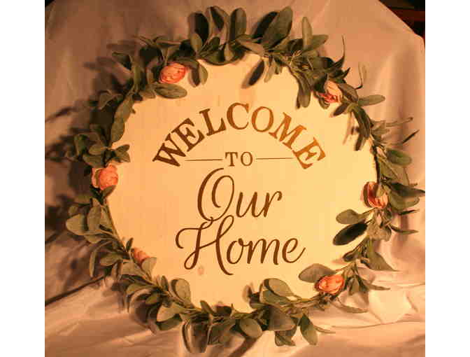 A circular plaque trimmed with floral garland to Welcome Guests to Your Home. The wreath is 18" in diameter.