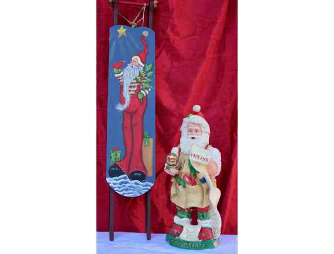 A collection of preowned Santa Items: a sleigh which is 24" high and has a painted Santa, the other item is a figurine titled "Santa's Magical Toy Shop" stands 13". The original box is included.