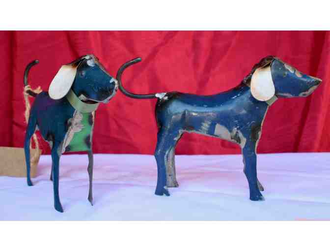 These primitive inspired pieces are handcrafted out of a reclaimed steel drum. Embracing the bold graphics and varying colors of this recycled medium each piece is a unique treasure and one of a kind. The dogs stand 5" high.