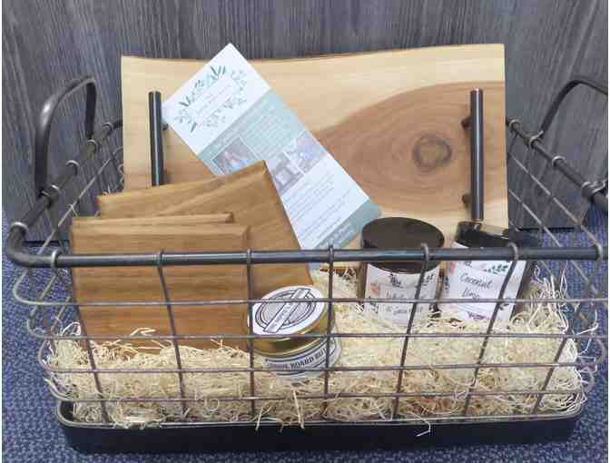 A rustic basket filled with amazing hand-made items! From The Hippie Wick Chick comes two scented natural soy candles - White Sage/Lavendar and Coconut Lime. From The Hippie's Husband comes a handmade Cedar Charcuterie Board (15.5 inches long) and 6 Bamboo Coasters. Also included is Hippie Board Butter to keep the wood looking lucious!