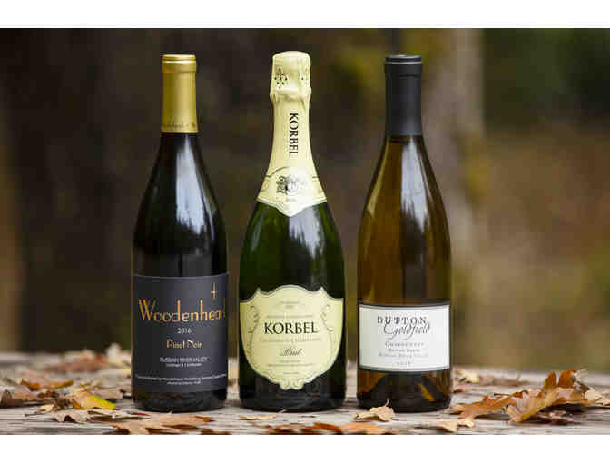 Woodenhead 2016 Pinot Noir; Korbel CA Champagne Brut; 2018 Dutton Goldfield Chardonnay