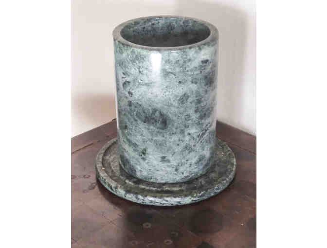 Stone kitchen utensil holder/tool crock. Approximately 4" diam, and 9" tall. Heavy. Two seperate pieces. We believe it it made of marble.