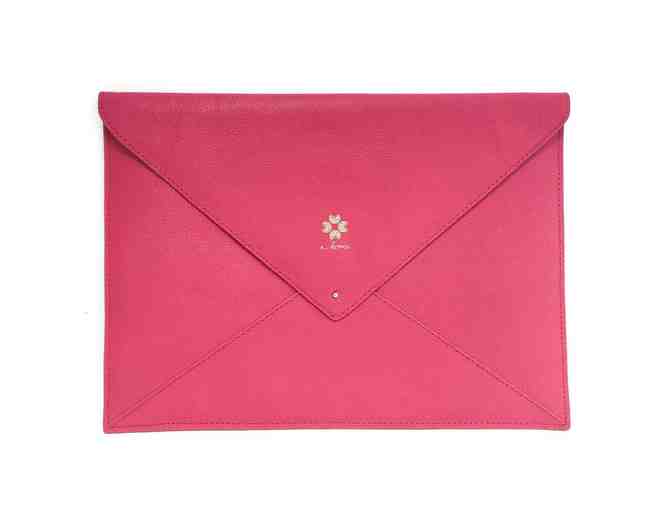 The Percy Envelope is a sharp-looking envelope that you will want to carry on its own. Designed to fit a tablet or mobile laptop, the back pocket is padded and lined with soft microsuede fabric. The front pocket will hold your pens and notepad. Gold hardware button closure.