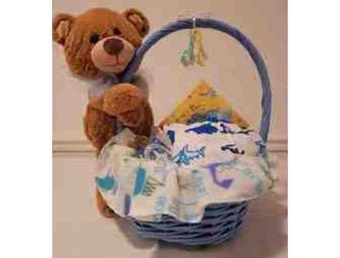 A blue wicker basket filled with a soft receiving blanket, a plush brown teddy bear, 0-3 mos. sleeper, My Life as a Baby, more books and baby items.
