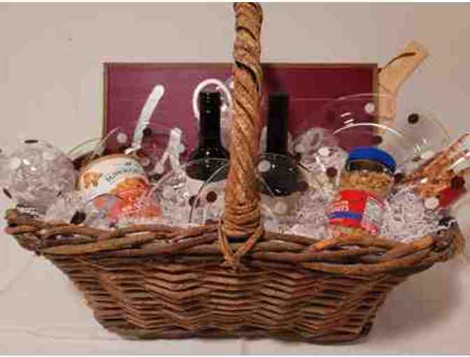 Large basket filled with four hand-painted wine glasses; four hand-painted appetizer plates; "Wine & Friends make the Perfect Blend" wood plaque; wrought-iron wine holder includes two bottles of red wine: Buenos Aires Red Blend 2020 and Atico Tempranillo Monastrell; large serving dish; large Bottella Disney wood wine-shaped serving board and snacks!