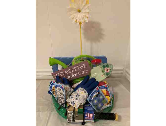 A 50 ft 5/8" medium duty weather flex garden hose encases a water can, garden tools, garden gloves, knee pad, and seed packets to grow Morning Glory, Marigolds, Alyssium and California Poppies - everything to start your own green thumb!