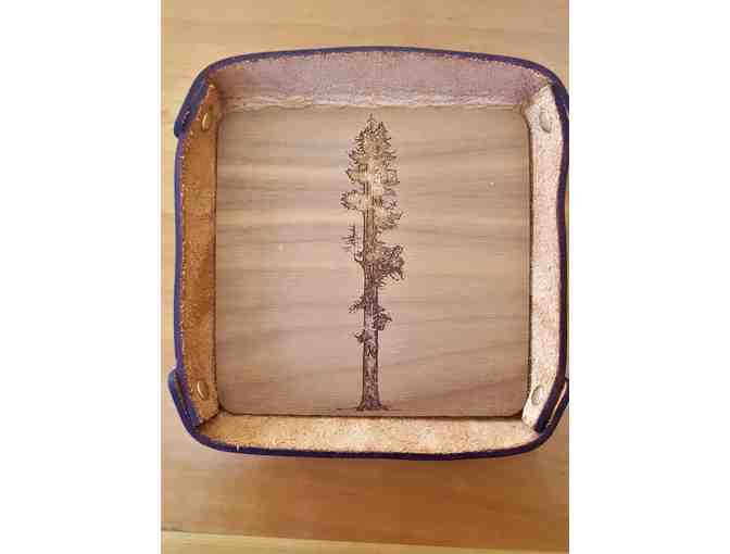 This little tray is made of recycled saddle leather with sides held with brass rivets , the outside inscribed with microscopic redwood cell cross sections, and the bottom laid with a walnut insert showing a laser-engraved redwood tree.  It measures 6-1/2" x 6-1/2" x 1" deep.