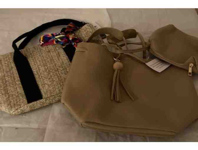 Beige synthetic purse 14" x 10 1/2" with zippered coin purse and 8" pouch container to match