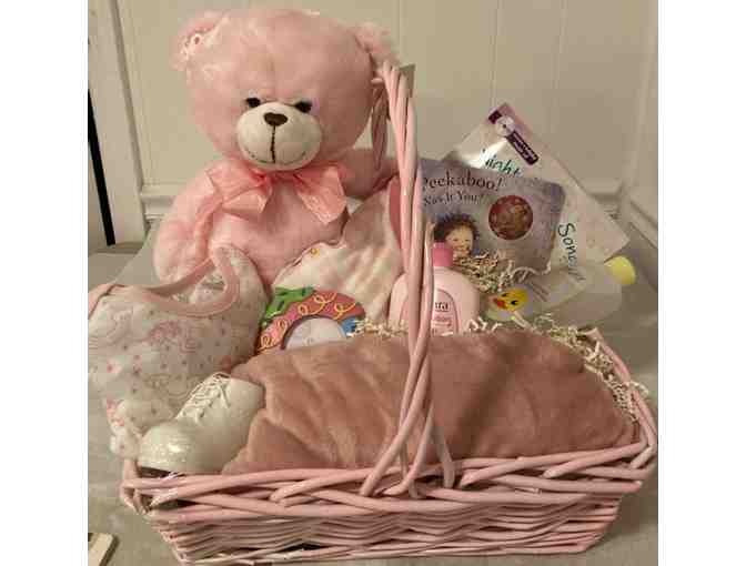 Large pink cuddley bear sits in a large pink wicker basket filled with: