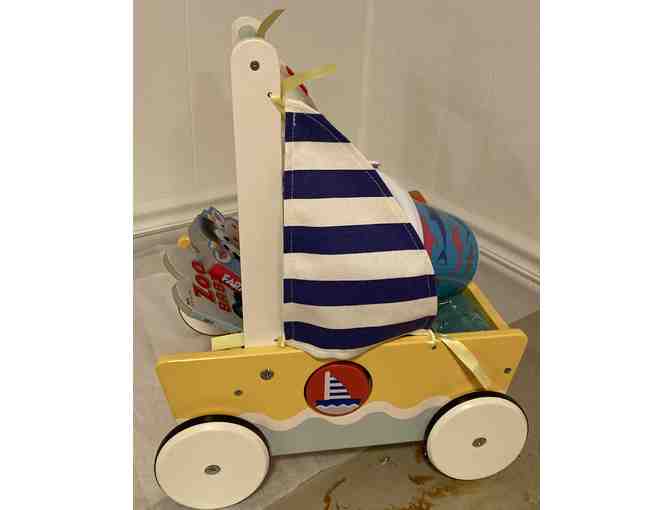 Your toddler can take his first steps with this kid-sized walker shaped like a boat filled with baby animal books and a beach pail to make sand castles!