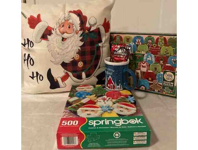 Christmas pillow a holiday mug with hot chocolate with two barely used Christmas puzzles (no missing pieces)