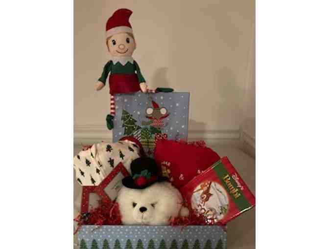 Holiday storage box filled with stuffed Christmas teddy bear; Disney's Christmas Bambi storybook; large elf that will fit on any shelf; holiday 3-6 mos sleeper; 12-18 mos pjs.