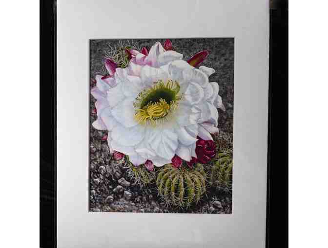 Bid on this beautiful acrylic painting of a barrel cactus with a white flower in bloom by Rita Hartman. The print is in a white mat and is ready to be framed!