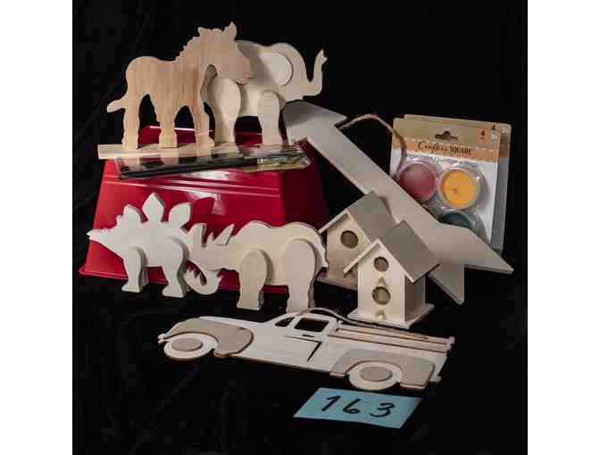 Wondering what to do with your kids when they complain that they are bored? Bid on this "Keep Them Busy" children's activity kit. The kit includes 2 sets of paint, 1 set of paint brushes (contains 6 brushes), and wood pieces ready to paint!