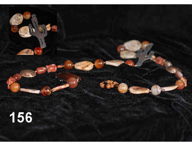This 41" bead, stone, and metal chain depicts the colors of Tucson's sky from dusk to dawn. The chain has 4 fetishes: 2 handmade copper suns and copper saguaros with stone and glass beads incorporated. The chain is made with jewelry wire for flexibility.