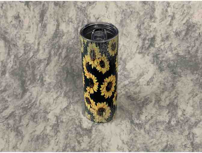 Enjoy this stylish 20 oz stainless steel sunflower tumbler. Comes with a vacuum seal locking easy slide lid and reusable plastic straw.