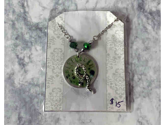 Share your Hogwarts House with everyone you meet with this handcrafted Slytherin Charm Necklace on a metal chain.