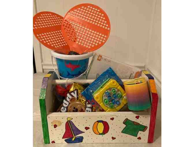 Hand-painted wooden tote with children's sound clock, bucket, cookies, fishing game, balls colorful Slinky.