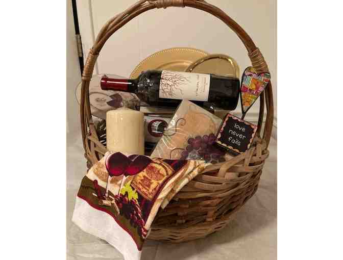 Large natural basket with six-piece wine rack with two bottles of wine: Crimson Root Red and Red Barn Cherry also includes a candle, napkins, a frame and serving tray.