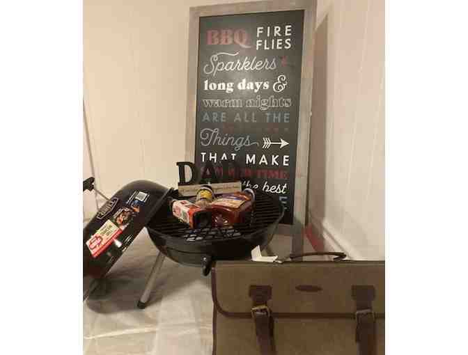 Grill the perfect burger with this Smith and Hawkins Grill tool set and Expert Grill portable Outdoor Charcoal BBQ Grill including several BBQ seasonings and a 31" x 16" grey wood stand up BBQ signage.