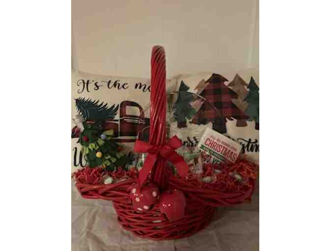 A large red wicker basket filled includes two soft tree-themed 16" x 16" pillows along with: