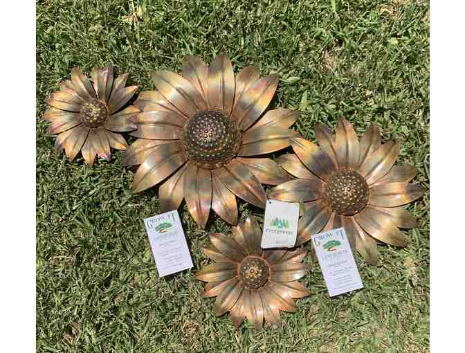 Spruce up your outdoor living space with this metal wall art depicting four delightful sunflowers.