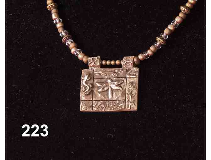 "Rugged but Radiant" is inspired by the Sonoran Desert. The necklace is made from brilliant bronze clay. The patina represents desert soil. The low designs are desert plants and creatures: lizard, butterfly, desert marigold, prickly pear, dragonfly, and a budding sprig of chuparosa. The designs were sanded to show the radiance of the desert.