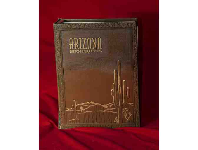 The full year of 1972 Arizona Highways. The set is bound in a leather case of Arizona Highways with a scene of the Sonoran Desert.