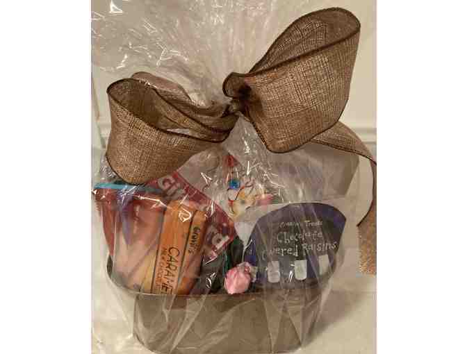 Large gold metal beverage container filled with 1 lb Dark Java Wave coffee, 12 oz chocolate raisins and more candy with a $50 Family Express gift card!