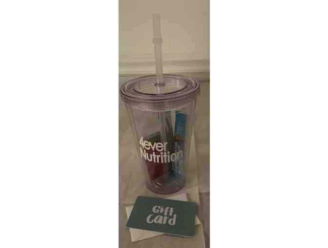 Start a healthy regime with a $50 gift card to 4ever Nutrition; comes with a plastic tumbler and flavored water enhancements.