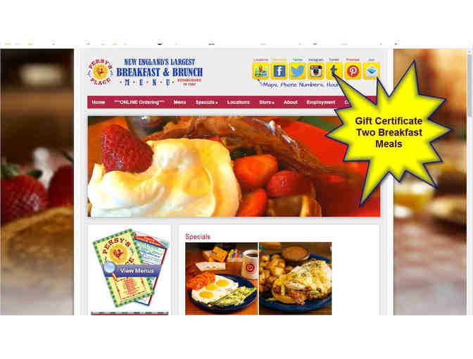 Gift Certificate for Two (2) Breakfast Meals at any Persy's Place 8 locations. https://persysplace.com/locations