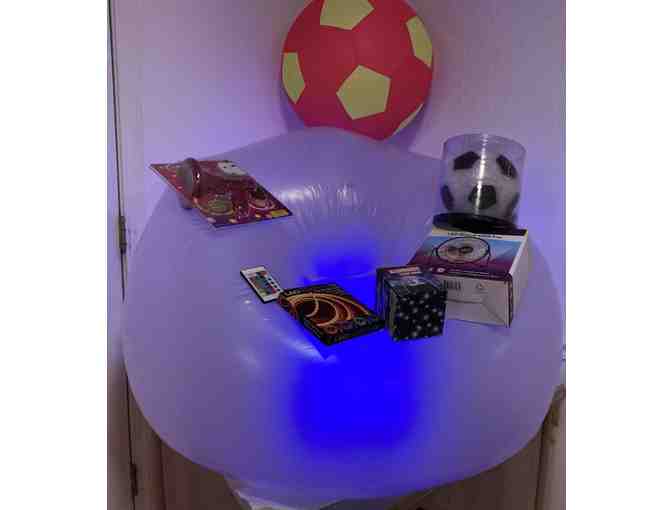 Large inflatable waterproof SIMI chair with multi-colored lights; voice changer with 10 different voices; 9.8 LED light strip with remote control; a Kaleioscope lamp; LED display USB fan; 9" soccer ball lamp.