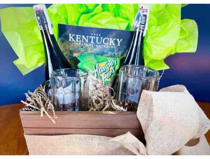 Get out of the concrete jungle and enjoy a 2 Night stay at the Lake Cumberland State Resort Park. Pack a cooler to hold these bottles Santa Claus Winter Warmer Lager and Antique Stag Porter. This basket is rounded out with two glass mugs for your drinks and some salty peanuts to accompany your cocktails.