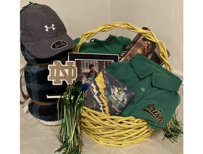 This large yellow wicker basket is filled with everything you need to show your Notre Dame spirit!