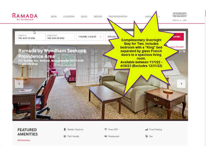 Nancy Marocco, Sales Director at The Ramada Banquet and Conference Center, located at 213 Taunton Avenue in Seekonk, MA has donated a Gift Certificate entitling the winning bidder and a Guest to a Complimentary Overnight Stay in an Executive Suite.