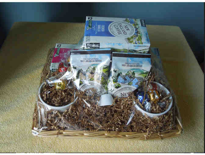 New England Coffee has donated a gift basket containing - Three (3) 12 cup boxes of assorted K-Cups, Two (2) 1lb. Bags of fresh ground 100% Arabica coffee, Two (2) Cafe mugs, 1 scoop and an assortment of delicious Lindor chocolate balls.
