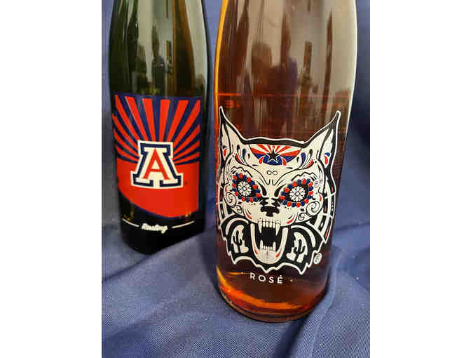Four University of Arizona wine bottles: Riesling, Rose, Sparkling White and Cab/Merlot Mix. Our donor says the wine is decent but this item is really about the bottles!